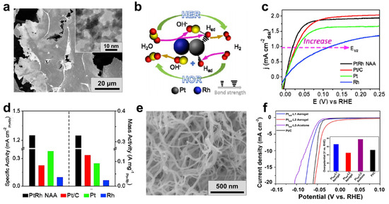 So far, electrocatalytic HOR has been only sporadically studied with MAs. As seen from Figure 7a, 2D lamellar Pt-Rh nanoalloy aerogels (NAAs) made up of ultrathin interweaved NWs were reported [93]. The authors claimed that strong electronic coupling between Pt and Rh can weaken the hydrogen binding energy (Figure 7b), thus leading to a lower half-wave potential (E1/2) of 17 mV, as well as the highest specific activity and mass activity (5.5 and 2.6 times higher than that of commercial Pt/C, respectively, at η = 50 mV) among all tested catalysts (Figure 7c,d).