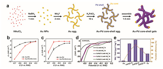 Besides CO2 conversion, a growing level of nitrate (NO3−) places another potential threat to the environment. To address it, Cu-rich Cu-Pd bimetallic aerogels were developed by choosing Pd as the active metal and Cu as the promoting metal [100]. Among all tested catalysts (Figure 8d,e), the Cu-Pd (3:1) aerogel stands out for the enhanced hydrogen adsorption at Pd-sites and the well-tuned d-band center of Cu. In this light, a high NO3− conversion rate (95.27%), ammonia selectivity (77.49%), and ammonia faradaic efficiency (90.02%) at 0.46 V vs. RHE were acquired. The superior performance could be attributed to the abundant catalytically active sites provided by the aerogel structure as well as the synergy of Cu and Pd.