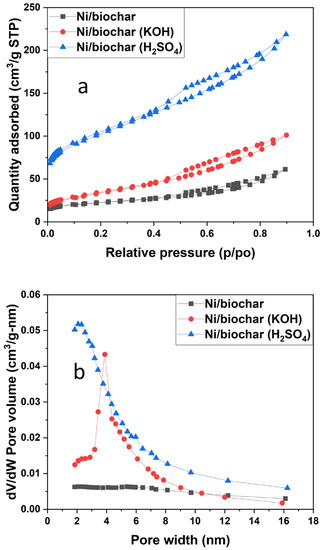 Surface area and pore volume of Ni/biochar, Ni/activated biochar, and Ni/acidified biochar.
