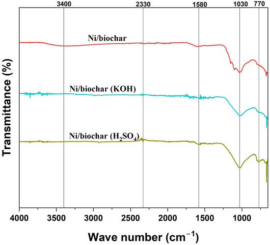 Figure 5 shows the FTIR spectra of the prepared Ni catalysts supported on biochar, biochar (KOH), and biochar (H2SO4). The results reveal the presence of several matching functional groups, such as a phenolic OH-group at 3400 cm−1 [40], carboxylic acids, -COOH, at 2330 cm−1 [41], -C-O stretching in cellulose at 1030 cm−1 [42], and C=C vibration for aromatic groups at 1580 cm−1 [40]. A decrease in the intensity of the –OH functional group peak and a slight decrease in the C=C vibration peak for aromatic groups can be observed in the spectrum of Ni/biochar (KOH) and Ni/biochar (H2SO4), indicating that some of the surface functionalities of the biochar support may have been lost as a result of acidic and basic treatments.