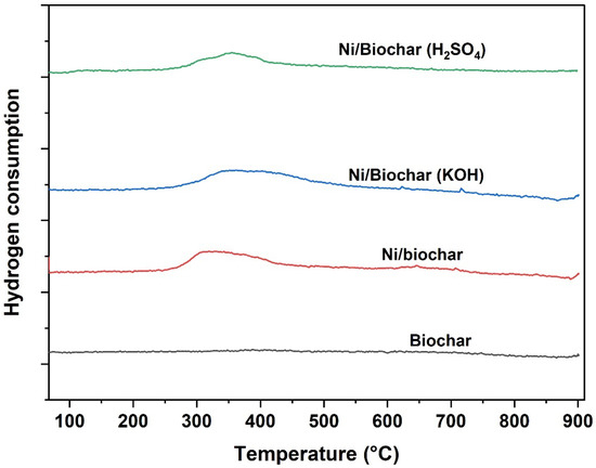 A study of the surface chemistry of the prepared catalyst was performed, particularly the reduction of the impregnated Ni metal and its oxides (NiO) in the catalyst. Temperature-programmed reduction (TPR) was carried out using hydrogen gas as a reducing agent, while CO2-TPD was also performed. Figure 6 shows the H2-TPR profiles of the raw biochar support and the 15 wt% Ni/biochar, 15 wt% Ni/biochar (KOH) and 15 wt% Ni/biochar (H2SO4) catalysts. No reduction peak can be observed in the raw biochar, confirming that the metal oxides found in the biochar as revealed by EDX and XRD remained in their oxide states even at high temperatures under constant hydrogen flow; thus, they were able to contribute to the reaction as catalysts. However, a reduction peak can be observed for the Ni-supported catalysts Ni/biochar, Ni/biochar (KOH), and Ni/biochar (H2SO4) at temperatures between 300 °C and 450 °C.