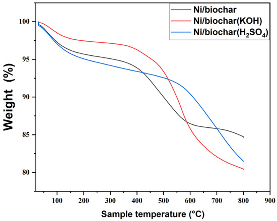 The thermal stability of the prepared catalysts was studied with the aid of TGA. The response of the catalysts to temperature can be seen in the TGA results displayed in Figure 8. The first thermal peak occurred at around 100 °C, with initial weight losses of about 2.5% (Ni/biochar (KOH) and 5% (Ni/biochar and Ni/biochar (H2SO4) being observed in the temperature range of 25 °C to 200 °C, which may be attributable to moisture loss, some light volatile compounds, and bound solvent evaporation [47]. This includes phenolic OH-groups and carboxylic acids, -COOH, as identified in the FTIR analysis shown in Figure 5.