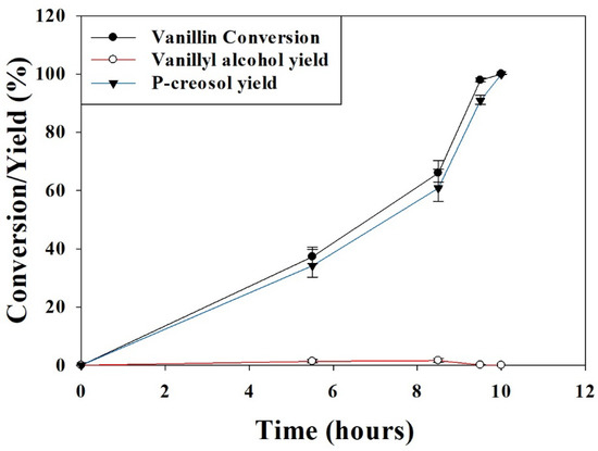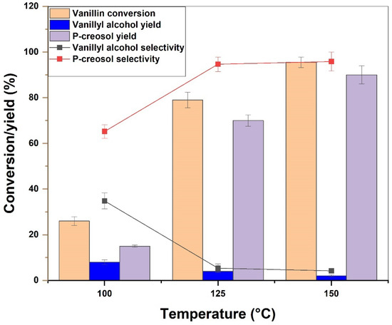 The effect of reaction temperature in the range of 100 to 150 °C was studied over Ni/biochar catalyst. The effect of reaction temperature on the HDO of vanillin is shown in Figure 10. With increasing reaction temperature, vanillin conversion as well as the selectivity of p-creosol and vanillyl alcohol change significantly. With an increase in reaction temperature from 100 °C to 150 °C, vanillin conversion increases from 26% to 95%, while p-creosol yield increases from 15% to 90%, and vanillyl alcohol yield decreases from 8% to 2%. It is evident that increased reaction temperature favors p-creosol selectivity, while simultaneously diminishing the selectivity toward vanillyl alcohol. This suggests that the HDO of vanillin is endothermic in nature [4,54], with the reaction rate generally increasing as the temperature rises [4]. Based on these results, p-creosol yield increases with an increase in temperature from 100 °C to 150 °C, while vanillyl alcohol yield decreases, showing that vanillyl alcohol is the intermediate product, and is converted via hydrogenolysis to p-creosol. Similarly, Ru/CNT catalysts for HDO of vanillin showed similar trends in selectivity for p-creosol and vanillyl alcohol when changing the temperature from 50 °C to 150 °C [55]. In other words, the hydrogenolysis of vanillyl alcohol advanced very rapidly at longer reaction times and high temperature [50]. Reactions at higher temperatures were found to exhibit p-creosol selectivity of up to 96%. As a consequence, at 150 °C, vanillin conversion was greater than 95% after 9.5 h, with a 99% p-creosol yield.