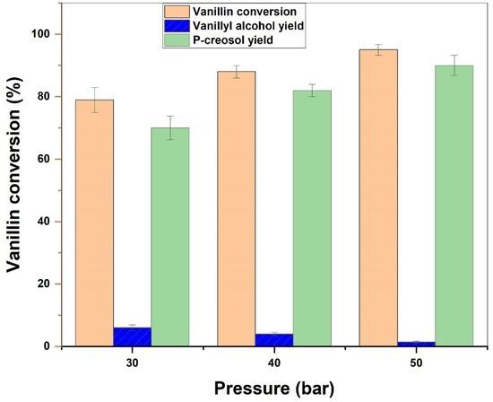 The effect of H2 pressure on the HDO of vanillin was studied from 30 bar to 50 bar at a constant temperature of 150 °C. As shown in Figure 11, an increase in pressure from 30 bar to 50 bar tends to increase vanillin conversion and p-creosol yield. Notably, at 50 bar, the yield of vanillyl alcohol is negligible compared to that obtained at pressures of 30 and 40 bar. Due to the increase in hydrogen pressure, the catalyst surface is exposed to more H2, allowing hydrogenolysis of vanillyl alcohol to occur more easily [3].