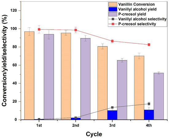 An investigation of Ni/biochar stability was carried out for fresh and used catalysts by reusing the catalyst recovered from the first, second, and third experimental cycles. The vanillin conversion, p-creosol and vanillyl alcohol yields and their selectivity after each cycle are shown in Figure 12.