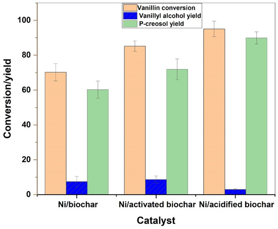 Vanillin HDO over noble metal catalysts such as Pd, Au, and Ru supported on biochars has been reported in the literature [5]. The economic considerations of the overall process are significantly impacted by the cost of noble metal: even though about 92% selectivity toward p-creosol was achieved at complete vanillin conversion after 3 h, the commercialization of noble metal catalysts for HDO is difficult because of their high cost. Furthermore, the following catalysts have been screened for HDO of vanillin: Pd/C, PdRh/Al2O3, Pd/Al2O3, Pt/C, Pt/SiO2, and Rh/Al2O3, finding that the bimetallic PdRh/Al2O3 catalyst consumed the lowest amount of hydrogen, and exhibited significantly high (99%) selectivity toward creosol [3,4]. The costs of catalyst carriers contribute substantially to the overall cost of HDO, in addition to the noble metals. The use of Ni/C catalyst for the HDO reaction of m-cresol as a bio-oil model compound has been reported, resulting in toluene and methylcyclohexane, as well as a variety of other non-HDO products [20]. Additionally, the results of an Ni-Co-P/HAP (hydroxyapatite) catalyst for in situ HDO of vanillin showed excellent catalytic activity, resulting in 97.86% conversion and 93.97% selectivity toward 2-methoxy-4-methylphenol [21]. In this study, a low-cost HDO catalyst was developed using nickel salt and biochar residue from the pyrolysis of biomass. The pyrolysis of biomass produces bio-oil and biochar as a residue. In this context, recycling biochar as a catalyst carrier for the HDO of bio-oil or its model compound will improve the overall economy of the process by means of circular economy [6]. By using renewable biochar as a catalyst carrier, and non-noble metals like nickel as active materials, the HDO process for bio-oil upgrade becomes more sustainable and cost-effective. Non-noble metals such as nickel, molybdenum, cobalt, copper, etc., make up the second group of HDO catalysts for bio-oil model compounds [22,23,24]. These non-precious metals demonstrate good activity as catalysts for upgrading bio-oil and its model compounds, and to achieve comparable selectivity and activity, they require higher metal loadings, usually by 10–15%, compared to their noble metal counterparts [25,26,27]. In contrast to noble metal catalysts, these catalysts have low activity and selectivity, but because of their lower cost and ease of design, they can be readily commercialized.
