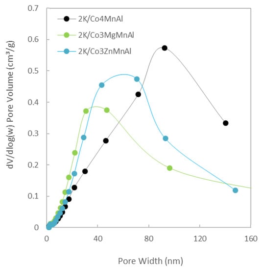 The pore size distribution profiles for the catalysts with different amounts of zinc and potassium are shown in Figure S1. The curve shapes are similar for all samples and no significant changes in the pore size distribution were observed with the modification of cobalt mixed oxide with different amounts of zinc and potassium. The comparison between the 2K/Co3ZnMnAl, the reference samples 2K/Co3MgMnAl, and the 2K/Co4MnAl catalysts is shown in Figure 1. All catalysts showed s unimodal pore size distribution: for cobalt mixed oxide modified by Mg and Zn (2K/Co3MgMnAl and 2K/Co3ZnMnAl), the maximum was around 38 and 60 nm, respectively. For the reference 2K/Co4MnAl sample, the maximum pore size was larger, around 90 nm, and this sample contained a higher number of larger pores. The trend corresponds well to the lowest surface area of this catalyst.