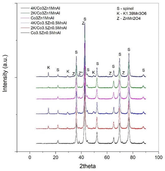 The XRD patterns of all the prepared catalysts are shown in Figure 2. In all samples, the peaks corresponding to crystallographic planes (1 1 1), (2 2 0), (3 1 1), (4 0 0), (4 2 2), (5 1 1), (4 4 0), (5 3 1), (6 2 0), (5 3 3), and (4 4 4) typical for the Co3O4 spinel-like phase (S) were found (PDF-2 card no. 01-073-1701). However, this diffraction line can also be ascribed to a different spinel with various substituted cations in the spinel’s structure, e.g., ZnAl2O4, CoAl2O4, or MnAl2O4. Unfortunately, it is not possible to determine the exact cationic composition of the spinels on the basis of the measured data. ZnO was not observed in any of the sample, but the ZnMn2O4 spinel phase (PDF-2 card no. 01-078-4751) can probably be found in potassium-free catalysts (Co3ZnMnAl and Co3.5Zn0.5MnAl). Its main diffraction line (42.2°) overlaps with the main diffraction line of the Co3O4 spinel-like phase (43.1°) and the line around 38° corresponds to the overlap of the ZnMn2O4 phase and the β-line of the main Co3O4 spinel-like diffraction line. In articles [37,40], this diffraction line was also attributed to the Mn2O3 phase (PDF-2 card no. 01-071-0636). Due to the similar ionic radius of Zn2+ (0.60 Å) and Co2+ (0.58 Å) [44], the substitution of tetrahedral Co2+ by Zn2+ is expected in the spinel lattice rather than the Zn segregation as another phase. For potassium-containing catalysts, the potassium manganese oxide phase at 2θ of 14°, 30°, and 50° was determined as K1.39Mn3O6 (PDF-2 card no. 01-080-7317). This finding agrees with other works in which the K-Mn-O phase was observed [37,45,46,47].