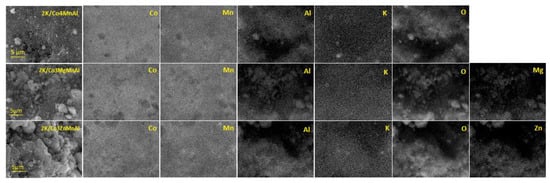The distributions of elements over cobalt mixed oxide catalysts, which were obtained by SEM mapping, are shown in Figure 5. The white dots represent the individual components. Not all elements were evenly distributed in the particles. Co, Mn, and Al are quite homogenous, however, there are visible places where only Al+O, Al+O+Mg or Al+O+Zn can be observed. The existence of aluminium oxide or spinel could be considered. The impregnated potassium is distributed almost homogeneously and uniformly.