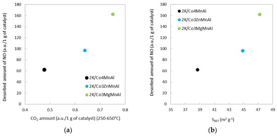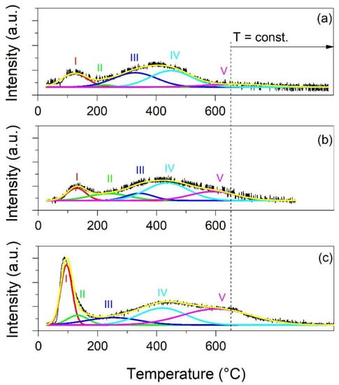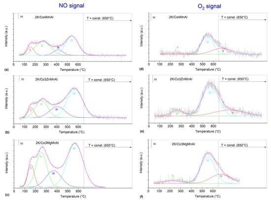Four visible peaks are created by the deconvolution of the NO signals (Figure 8a–c). All deconvoluted peaks are the largest for the 2K/Co3MgMnAl mixed oxide catalyst compared to the other catalysts (Table 7). The increasing amount of adsorbed NO may be connected with an increase in the specific surface area or/and the increasing basicity of the samples. The main desorption peak (peak IV) is developed together with the IV. temperature O2 desorption peak. It suggests that the formation of the NOxࢤ surface intermediates after the NO adsorption and their decomposition was in the high-temperature range according to [33,51,70,72] since the O2/NO molar ratio is close to 0.5 (Table 7). In our previous paper [51], it was also discussed that the decrease in the oxygen signal is much slower than the decrease in the NO signal in the isothermal part of the measurement, suggesting that the oxygen peak consists of two different peaks, and the high temperature one (region IV) is responsible for the desorption of oxygen from the surface by the recombination of oxygen atoms. A similar dependence is also observed for the samples presented in this investigation.