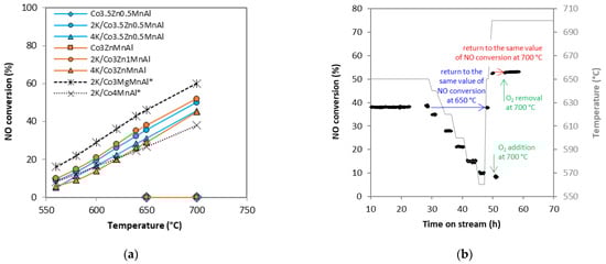 Dependence of NO conversion on (a) temperature over potassium-promoted mixed oxide catalysts; (b) time on stream over 2K/Co3ZnMnAl mixed oxide. Conditions: 0.1 mol.% NO or 0.1 mol.% NO and 2 mol.% O2 in N2, WHSV = 6 l g−1 h−1, * reference sample [40].