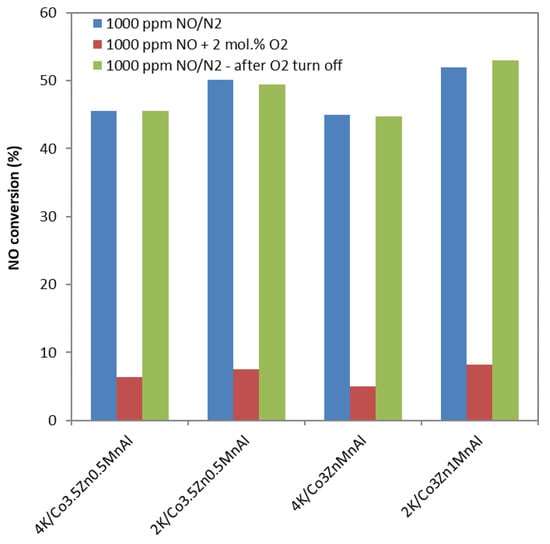 All catalysts were also tested for their NO decomposition in an oxygen atmosphere (2 mol.%). The final NO conversion achieved was 5 to 8%, which means a decrease of approximately 84–89% from the original value in an inert atmosphere. The inhibition was reversible; after oxygen was removed from the reaction gas, the initial NO conversion was obtained (Figure 10). In the same trend, a large drop in the NO conversion in the oxygen stream and a return to the same NO conversion was also previously observed for 2K/Co3MgMnAl catalysts [40,51].