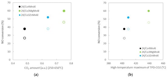 The stability of the prepared catalysts was also verified. The time dependence of a NO conversion over the 2K/Co3ZnMnAl mixed oxide catalyst is shown in Figure 9b. The catalyst was exposed to the reaction conditions for almost 60 h, confirming the stable performance of the catalyst.