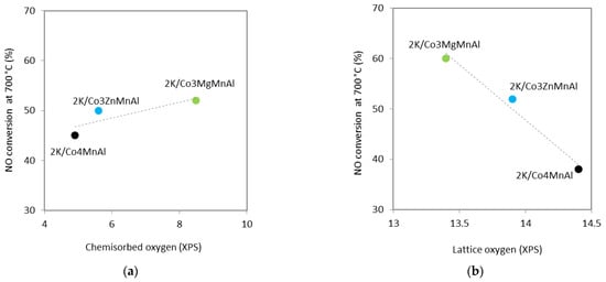 The temperature dependence of the NO conversion is shown in Figure 9a. The results of the reference samples 2K/Co3MgMnAl and 2K/Co4MnAl [40] were added for comparison. Co-Zn-Mn-Al mixed oxide catalysts without potassium were not active in the NO decomposition unlike the potassium-promoted samples. The potassium content influenced the catalyst’s activity. A higher NO conversion was achieved over the samples modified by 2 wt.% K compared to the catalyst modified by 4 wt.% K. On the contrary, the amount of zinc content (Zn molar content 0.5 or 1) did not influence the final NO conversion. The same trends were observed in the case of the substitution of Co with magnesium [40], where the optimal potassium content was between 1 and 2 wt.% and the substitution of Mg for cobalt in the range of 0.2 to 1 in terms of the molar content did not affect the NO conversion. A partial cobalt substitution in the base 2K/Co4MnAl mixed oxide had a positive effect on the NO conversion and this effect was in the order of Mg > Zn > non-substituted catalyst.