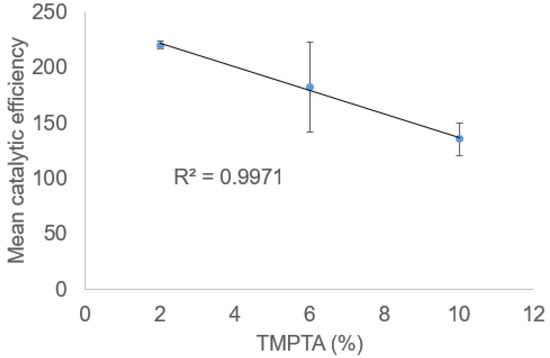 Figure 1 shows that there is an almost linear decreasing trend of catalytic efficiency with increasing TMPTA content, which was expected because tighter polymer networks are formed with higher TMPTA contents, reducing accessibility to catalytic sites. The large standard deviation bars are justifiable, as they were determined with data from different experiments.