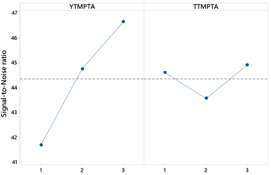 To statistically corroborate the relationship between catalytic efficiency and cross-linking density, the effects of YTMPTA and TTMPTA factor levels on the signal-to-noise ratio was assessed using an analysis of variance (Figure 2) [22].