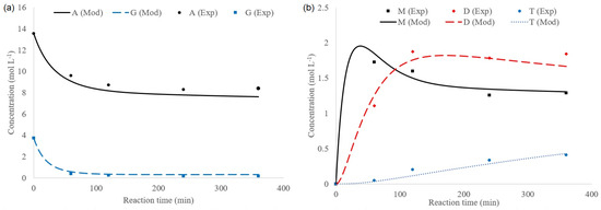 Curve fitting for concentration profiles of run S9 (YTMPTA = 0.02, TTMPTA = 270 min). Exp—experimental data; Mod—kinetic model predictions; (a) Glycerol and acetic acid concentrations: A—acetic acid; G—glycerol; (b) Acetates concentration: M—monoacetin; D—diacetin; T—triacetin.