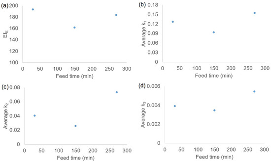 Effect of TMPTA feed time on catalytic efficiency (EfE) and kinetic parameters (k1, k2, k3). (a) Average experimental catalytic efficiency of glycerol consumption in 6 h of reaction (L2 mol−2 min−1). Average rate constants of reactions: (b) 1, (c) 2, and (d) 3.