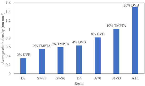 Mean chain densities of commercial and synthesized resins. D and A represent the commercial resins Dowex and Amberlyst, respectively [28].