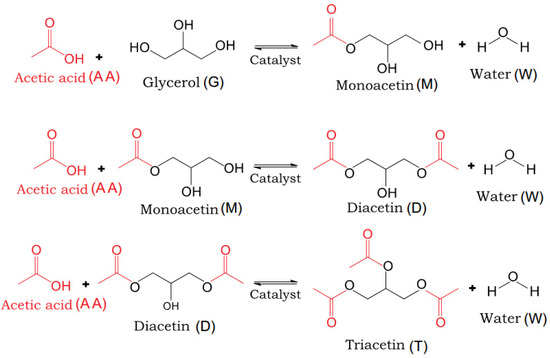 Glycerol acetylation. The isomers 1- and 2-monoacetin and 1,2- and 1,3-diacetin are formed during the process [35].
