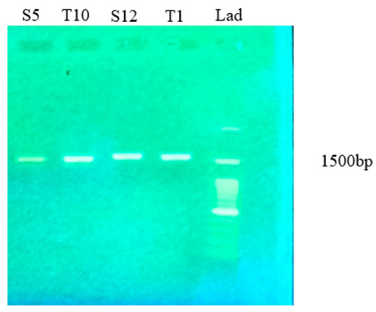 Identification of 16S rRNA gene bands of enzyme-producing bacteria with a molecular weight of 1500 bp; Lad is a molecular marker.