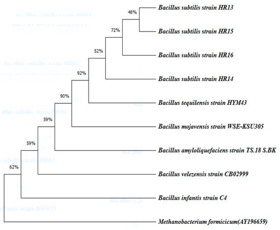 Identification techniques based on molecular studies are essential and accurate instruments for the proper characterization of microbial species. In this regard, four bacterial strains (HR13, HR16, HR15, and HR14) that had the highest α-amylase activity were identified by 16S rRNA gene analysis (Figure 2). All four strains with the capacity to produce α-amylase enzyme aligned most closely to the Bacillus genus, Bacillaceae family, and Bacillus subtilis species, according to the NCBI database’s analysis of the nucleotide sequence of the 16S rRNA gene of isolated bacteria. Based on these results, the bacterial strains (HR13, HR16, HR15, and HR14) have the highest similarity (99%) with B. subtilis strains HFBP08, ZIM3, SXK, and soilG2B. According to the results of 16S rRNA gene sequences, B. subtilis strain HR13, B. subtilis strain HR14, B. subtilis strain HR15 B., and B. subtilis strain HR16 were registered in the NCBI database with accession numbers MZ571841, MZ571838, MZ571839, and MZ571840, respectively. The phylogenetic tree of B. subtilis strains HR13, HR14, HR15 B., and HR16 isolated from the fish intestine in this study, as well as sequences available in NCBI for B. Methanobacterium formicicum, B. infantis strain C4, B. amyloliquefaciens strain TS.18 S.BK, B. velezensis strain CB02999, B. tequilensis strain HYM43, and B. mojavensis strain WSE-KSU305, were drawn and their evolutionary relationships were investigated (Figure 3). The evolutionary relationships of the strains obtained in this research with other Bacillus species, including B. infantis, B. amyloliquefaciens, B. velezensis, B. tequilensis, and B. mojavensis, are shown in a phylogenetic tree. Therefore, the present study shows that the strains belonging to B. subtilis are potential bacteria for the production of the α-amylase enzyme.