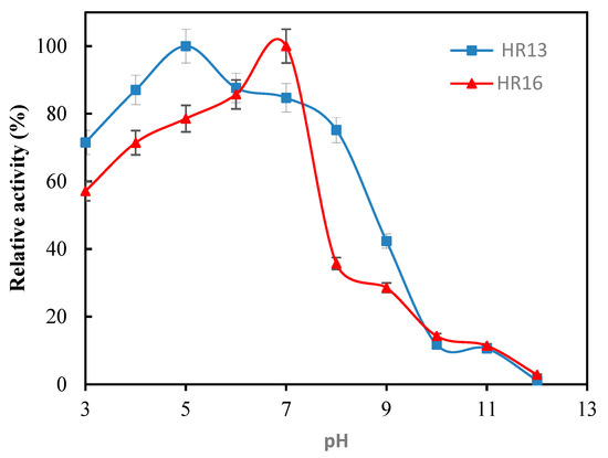 The impact of pH on the enzyme activity levels of HR13 (■) and HR16 (▲); the activity at the optimal pH was taken as 100%.