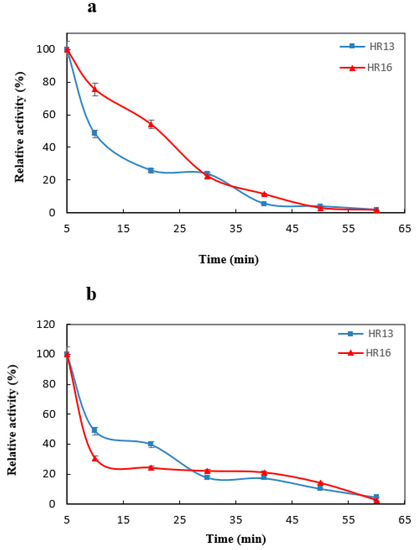 Thermal stability of the α-amylase enzyme activity of HR13 (■) and HR16 (▲) after incubating the enzymes in a water bath at 80 °C (a) and 90 °C (b) for different time periods.