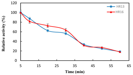 Irreversible thermal inactivation of enzymes isolated from B. subtilis strains HR13 and HR16 at temperatures of 80 and 90 °C demonstrated that at 80 °C with increasing incubation time (Figure 6), the amount of enzyme activity decreased, and after temperature incubation for up to 10 min, the enzyme activity in the HR13 B. subtilis strain reaches less than half. However, the enzyme of B. subtilis strain HR16 maintained > 50% of its initial activity after a temperature incubation for 20 min at 80 °C. Notably, after 60 min of temperature incubation, the activity of both enzyme strains reached almost zero.