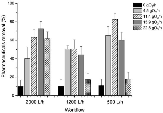A clear relationship was also observed between the pharmaceutical removal percentages and ozone production, according to Dawood et al., 2021 [29]. In particular, an increase in the ozone dose applied was related to an increase in pharmaceuticals removal, reaching maximum values of 72.5 ± 7.8% working with 15.9 gO3/h, 50.3 ± 10.2% working with 11.4 gO3/h and 82.7 ± 6.2% working with 11.4 gO3/h, when 2000 L/h, 1200 L/h, and 500 L/h workflow were tested, respectively. However, a decrease in removal efficiency was observed in all cases when working at maximum ozone production values (22.8 gO3/h). These effects may be related to ozone solubility. In general, the increase in ozone concentration promotes the transfer of ozone from the gas phase to the liquid phase up to the solubility limit. At this point, there is no transfer of a greater supply of ozone to the liquid phase, so the efficiency of pharmaceutical removal remains constant or even decreases, according to Joseph et al. (2021) [32]. This was tested experimentally by measuring dissolved oxygen (indigo method). In all cases, the dissolved ozone percentage increased as the inlet ozone concentration increased, reaching a maximum value of 82.0% working with 15.9 gO3/h, a dissolved ozone percentage similar to those reported by Kokkoli et al. (2021) [33]. From that point on, this percentage remained constant and even decreased, thus corroborating our hypothesis.