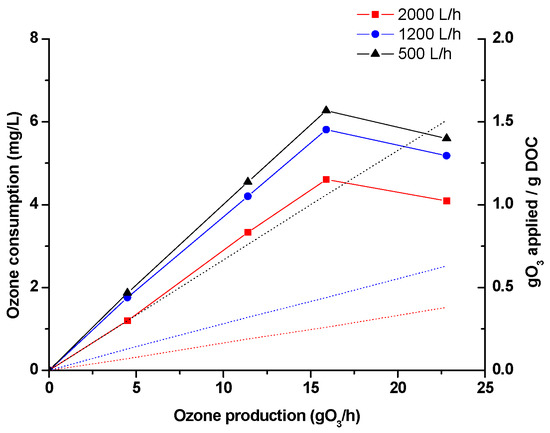 The percentages obtained from Figure 1 were also related to the ozone consumed in the process. The results (Figure 2) showed that the highest ozone consumption occurred at 500 L/h, followed by 1200 L/h and 2000 L/h, respectively. This allowed us to corroborate the hypotheses and justify the results presented above. In this sense, at high flows, indirect O3 reactions would predominate, due to the presence of a greater number of radical species (•OH), due to the reactivity of the MNBs (molecular collision). However, at low flows, direct O3 reactions may predominate. In both cases, the reactivity would be greater than at intermediate flows, where the contact time between molecules is lower, and there is not enough flow to make collisions between molecules too effective, so there would be a balance between direct and indirect reactions, limiting them both. On the other hand, a decrease in ozone consumption was observed at the highest ozone generation rate, verifying that this concentration reaches the O3 solubility limit.