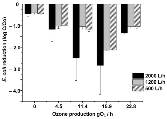 Considering that the initial abundance of E. coli in the inlet wastewater was 2.3 × 104 ± 1.1 × 104 CFU/100 mL (see Table S1), 15.9 gO3/h of ozone production was the only condition able to inactivate E. Coli values below LOD, showing reduction values of up to 4-log, while lower removal efficiencies were obtained for the other conditions tested. In all cases, the best removal efficiencies were observed using the 2000 L/h workflow, due to increased reactivity as a result of the collisions between molecules, while the use of air MNBs managed to remove an average of 0.5 log, demonstrating that the hydroxyl radicals alone, generated by the collapse of the MNBs, have a disinfectant activity, according to Sumikura et al., 2007 [40]. In this work, the authors reported a 24.5% removal of E. coli in wastewater using micro-air bubbles, while this percentage increased progressively when increasing amounts of ozone were added.