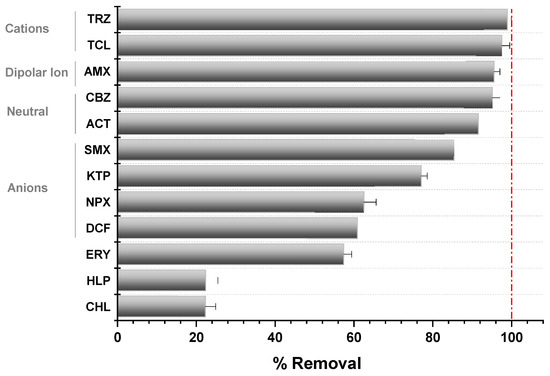 Despite the high efficiencies in pharmaceutical removal obtained under the different operational conditions studied, not all compounds behaved in the same way in the O3/MNBs system. Specifically, of the 12 pharmaceuticals analyzed, 6 of them showed high removal percentages, reaching, in all cases, values higher than% (TRZ, TCL, AMX, CBZ, ACT, and SMX), 4 of them (KTP, NPX, DCF, and ERY) showed moderate efficiencies (between 57.62% and 77.34%), while the remaining 2 (HLP and CHL) had low removal efficiencies (approximately 22.50%, see Figure 4). This may be related to the structure and functional groups of the pharmaceuticals to be degraded and, therefore, to the reactivity of these groups with O3 and •OH radicals in an aqueous solution, and may result in oxidation processes, cycloadditions, or mainly electrophilic substitution reactions according to Beltran et al., 2003 [41]. Specifically, the presence of electron-rich functional groups has been reported to react with O3 molecules by electrophilic substitution via electron transfer, increasing removal percentages [42]. These groups include C=C bonds (mainly found in CBZ), nitrogen-containing compounds (mainly found in TRZ, TCL, or SMX), or organosulfur compounds such AMX. However, electron-withdrawing functional groups, such as fluoro, chloro, or carboxyl groups (found in DCF, CHL, or HLP) reduce electronic density from pharmaceuticals inhibiting electrophilic substitution reactions, resulting in a shielding effect [36]. In this perspective, and in order to simplify and predict the pharmaceutical removal efficiency in O3/MNBs systems, the removal percentages obtained were directly associated with the ionic capacity of the pharmaceuticals, following the trend: cationic compounds > dipolar ions > neutral compounds > anionic compounds. Thus, cationic, dipolar ions, and neutral compounds would be considered as high removal rate compounds, while the anionic compounds would be considered as compounds with moderate removal percentages. However, CHL and HPL, despite being cationic compounds, showed the lowest removal rates (22.5 ± 2.6% and 22.5 ± 3.1%, respectively). This behavior could be associated with the presence of electron-withdrawing functional groups (mainly fluoro and choro in their structure, limiting their removal [43]. On the other hand, another exception to this behavior was the case of ERY. Despite being a neutral compound, its low reactivity was due to the scarcity of its C=C bond and other electron-rich functional groups in their structure, which limited its reactivity. In this sense, knowing the polarity and chemical structure of the pharmaceuticals to be degraded by O3/MNBs reactions could be crucial for predicting the removal efficiency of selected compounds in real systems.