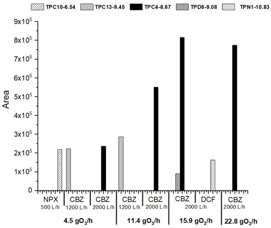 Significant differences were observed according to the different workflows. In particular, TPC4 (carbamazepine by-product) was the largest by-product area and was detected only at the 2000 L/h (see Figure 5). It formed from 4.5 gO3/h and the peak area increased following the ozone production, while a small decrease was detected at 22.8 gO3/h, following a pattern similar to the pharmaceutical’s behaviour. Although several authors have found this by-product of carbamazepine in ozonation reactions, and some of them have reported it as one of the most persistent TPs [56,57], it was Kråkström et al. (2020) [51] who first associated this mass to a specific structure (2,2′-azanediyldibenzaldehyde) using NMR. The authors reported that this by-product was formed via radical reactions from the intermediate product N, N-bis(2-formylphenyl) urea, continuing to react with •OH radicals forming other intermediates, confirming their quick reactivity under higher flow rates.
