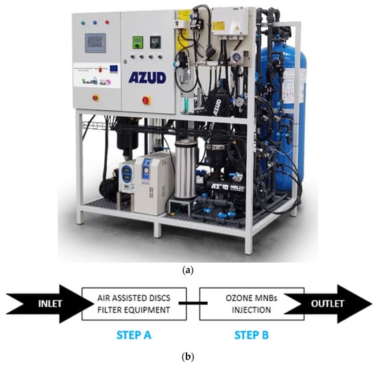 The combined O3/MNBs full-scale system (Figure 6a) was a non-commercial system specifically designed by SISTEMA AZUD, S. A. for these tests. It was installed in a conventional WWTP located in Murcia Region (Spain) (latitude 37°47′48″ N, longitude 0°57′36″ W). Specifically, this WWTP receives domestic and industrial effluents from three municipalities (Roldán, Lo Ferro, and Balsicas) and has a maximum treatment capacity of 2,007,500 m3/year of wastewater. The water line consists of a primary treatment, followed by an activated sludge secondary treatment with extended aeration and sedimentation, and a final tertiary treatment based on coagulation–flocculation, sand filter, and disinfection using UV radiation. WWTP effluents are commonly used for agricultural irrigation.