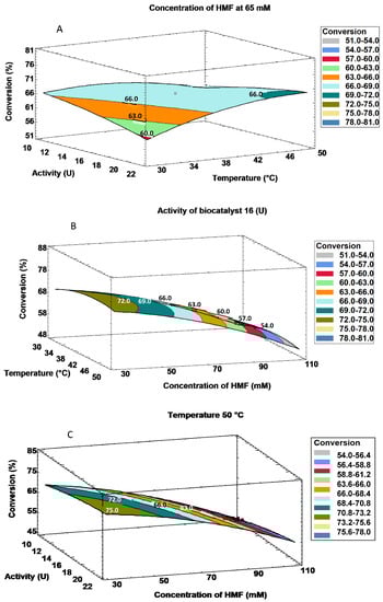 The analysis of variance (ANOVA) (Table S4) showed a correlation of 89.3%, while the p-values of the variables and their interactions were shown to be significant with a confidence value of 95% because the p-values were lower than 0.05 for all variables and their interactions. The variables and their interactions that presented the greatest significance (p-value = 0.05) were the temperature, the concentration of HMF, temperature squared, the interaction between the temperature and the activity of the biocatalyst, HMF concentration squared, and the interaction between the concentration and the activity of the biocatalyst. These values agree with the Pareto diagram in Figure 4, which indicates that the interactions between these variables have the greatest standardized effects.