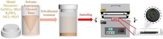 Ni and Pd-incorporated Fe3O4 (Ni-Pd/Fe3O4) spherical yolk-shelled nanocatalyst was synthesized via a modified combination method [40]. Fe(NO3)3·9H2O and K2PdCl4 or NiCl2·6H2O were used as metal precursors and dissolved in a mixture of deionized water, isopropanol, and glycerol (Figure 1). On the basis of our experimental observations in the present study and previous works [40,41], the formation of the yolk-shelled structure of Ni-Pd/Fe3O4 nanospheres could be explained by a self-templating mechanism. First, Fe, Ni and Pd ions coordinate with isopropanol to form Ni/Pd-incorporated Fe-isopropanol solid nanospheres in the solvothermal process. The resulting Ni/Pd-incorporated Fe-isopropanol solid nanospheres then gradually transform into a relatively thermodynamically stable Ni/Pd incorporated Fe-glycerate composite. During the solvothermal transformation process, Ni/Pd-incorporated Fe-glycerate grow on the surface of Ni/Pd incorporated Fe-isopropyl alcohol nanospheres at the expense of the gradual consumption of Ni/Pd-incorporated Fe-isopropanol. After the completion of this reaction, the Ni/Pd-incorporated Fe-isopropanol solid nanospheres partially convert into yolk-shelled nanospheres consisting of a Ni/Pd-incorporated Fe-glycerate shell and a Fe-isopropyl alcohol solid core. Finally, the obtained Ni/Pd-incorporated Fe-glycerate composite was annealed and transformed into a Ni-Pd/Fe3O4 yolk-shelled nanospherical catalyst.
