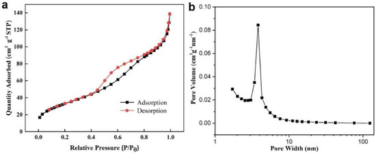 (a) N2 adsorption–desorption isotherms and (b) pore size distribution for Ni-Pd/Fe3O4 catalyst.
