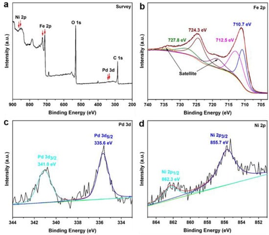 (a) XPS survey spectra of Ni-Pd/Fe3O4. High-resolution spectra of Fe 2p (b), Pd 3d (c), and Ni 2p (d).
