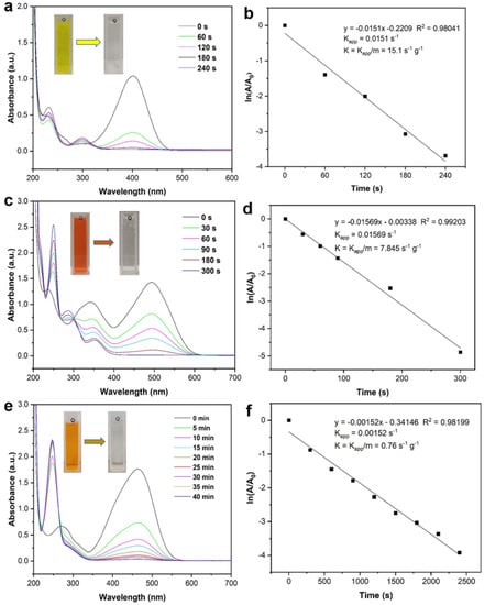 Time-dependent UV–vis spectra for (a) 4-NP, (c) CR, and (e) MO reduction by NaBH4 in the presence of Ni-Pd/Fe3O4 catalyst. Insets in Figure 4b,c are the photographs showing the color fading of the reaction mixture. Rate constant versus time for (b) 4-NP, (d) CR, and (f) MO reduction by NaBH4 in the presence of Ni-Pd/Fe3O4 catalyst.