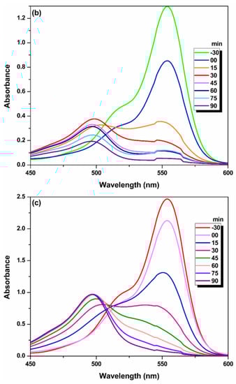 The reaction mechanism of RhB degradation depends on pH, a kind of reactive species attacking the pollutant, which in turn depends on the catalyst, and oxidant interaction. The absorption maximum of RhB was found to be 554 nm, which undergoes a blue shift (hypsochromic shift) with increased reaction time, which implies the de-ethylation of RhB by the attack of reactive species. The spectral changes in RhB with the PMS activation by Fe-Mn (2:1) oxide at different pH are provided in Figure 5. In general, hypsochromic shift of RhB occurs in stages [31]. RhB transforms to N,N-diehyl-N’-ethyl-rhodamine 110, N,N-diethyl-rhodamine 110, N-ehyl-N’-ethyl-rhodamine 110, and N-ethyl-rhodamine 110 sequentially and finally to rhodamine 110. Degradation of RhB occurs only after the removal of four ethyl groups and conversion to rhodamine 110. This was also observed with the decrease in absorbance after the hypsochromic shift.