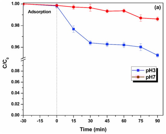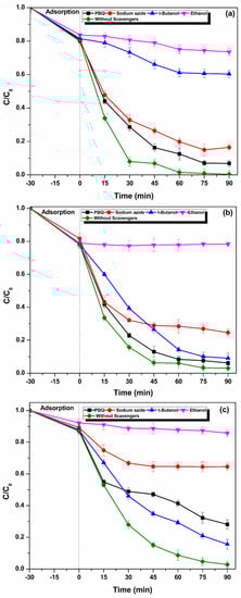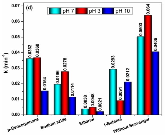Interpreting the reaction kinetics for all the scavenging experiments, it is found that all the reactions follow first order kinetics. A straight line graph obtained by plotting ln(C0/C) vs. time confirms the first order reaction and the slope of the graph gives the rate constant. [Rate of reaction for first order is kt = ln(C0/C)]. Through the scavenging experiments carried out, it was found that hydroxyl radicals are predominantly present at pH 3 (60% contribution) (k = 0.0091 min−1) (Figure 7); while at pH 7 and 10, the hydroxyl radical contribution was less with rate constant of 0.0293 min−1 and 0.0212 min−1 (contribution- 9%, 15%, respectively). The experiments also showcase the sulphate radical dominance at pH 7 and 10 (k = 0.0038 min−1, 0.0021 min−1, respectively) with a total count of 70% in both conditions, while at pH 3 its contribution remains very low; 13%, k = 0.0048 min−1. Hence, in acidic conditions, hydroxyl radicals are the dominating species responsible for degradation of dye, while sulphate radicals play major role in neutral and basic conditions. A significant presence of singlet oxygen was observed in basic conditions contributing 65% of total species (k = 0.0114 min−1) but at neutral conditions, 25% (k = 0.0196 min−1) and acidic it is reduced to 16% (k = 0.0278 min−1). Superoxides were extremely ineffective in the system, contributing less in all pH conditions.