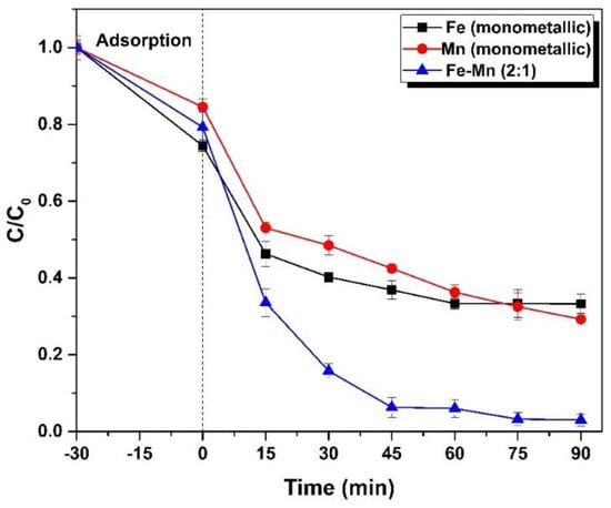 The bimetallic catalyst synthesized was compared with the monometallic catalyst at optimum conditions (Figure 8). The bimetallic catalyst activity for activating PMS causes a total degradation of 96% in 90 min at pH 7 with optimized conditions but the catalytic activity of iron oxide and manganese oxide were found as 66% and 71%, respectively. The degradation trend was gradual by Mn oxide catalyst but iron oxide, after 15 min, shows very slow degradation. Kang and Hwang [45] also compared the monometallic Co and Mn systems with the bimetallic Co-Mn system. They found that Co monometallic caused 93% degradation in 1 h and Mn monometallic achieved just 36 % removal efficiency in 80 min in contrast to bimetallic system giving full degradation in 40 min [45].