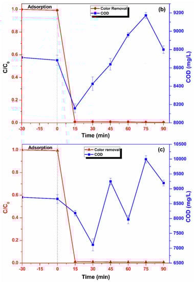 Treatment of real textile wastewater with: (a) 0.25 mM PMS and 100 mg/L catalyst dosage, (b) 2.5 mM PMS and 1000 mg/L catalyst dosage and (c) 1.25 mM PMS and 500 mg/L catalyst dosage.