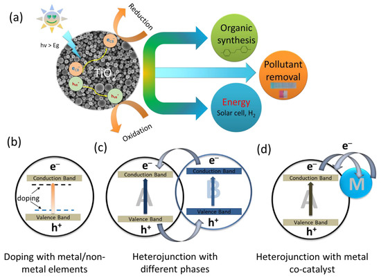 (a) Photocatalytic reaction by TiO2 and their applications; (b) doping effects; (c) heterojunction with other semiconductors or phases; (d) heterojunction with metal cocatalyst.
