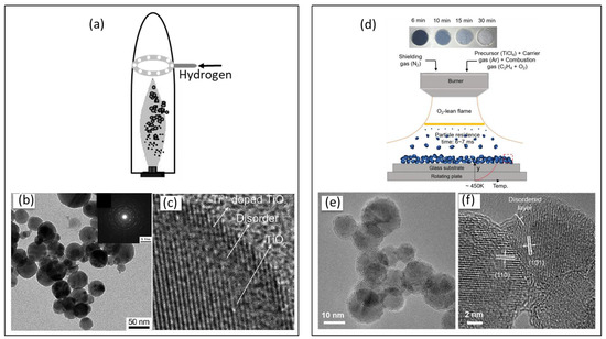 Synthesis of the defected TiO2 prepared by two flame reactors. The in situ hydrogenation reactor: (a) reactor setup; (b,c) TEM and HR-TEM images of powder prepared from the in situ hydrogenation reactor (Re-printed/adapted with permission from Ref. [84]. Copyright 2014, the Royal Chemical Society). Flame stabilized on a rotating surface (FSRS): (d) FSRS setup; (e,f) TEM and HR-TEM images of the formed product at a 6 min deposition time (Re-printed/adapted with permission from Ref. [86]. Copyright 2020, John Wiley and Sons).