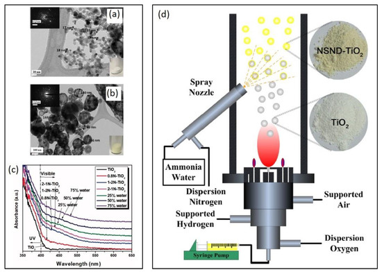 N-doped TiO2 synthesized by mixing N-contained materials with Ti precursor and by supplying NH3 solution into the flame chamber. TEM and digital camera images of TiO2: (a) pristine TiO2; (b) 1 M HNO3-1M urea (Re-printed/adapted with permission from Ref. [97]. Copyright 2018 Elsevier). (c) Effects of the addition of water on UV-vis absorption spectra of N-doped TiO2 (Re-printed/adapted with permission from Ref. [79]. Copyright 2018, Taylor & Francis). (d) FS setup for N-doped TiO2 synthesized by NH3 spray and images of the undoped and N-doped TiO2 powder (Re-printed/adapted with permission from Ref. [98]. Copyright 2014, Elsevier).