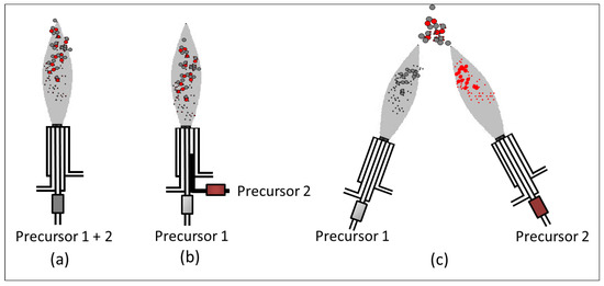 Feeding methods for the synthesis of composite materials by FS: (a) all precursors are mixed and fed together; (b) precursors are fed separately into different pots of the same nozzle (burner); (c) precursors are fed separately into different nozzles.
