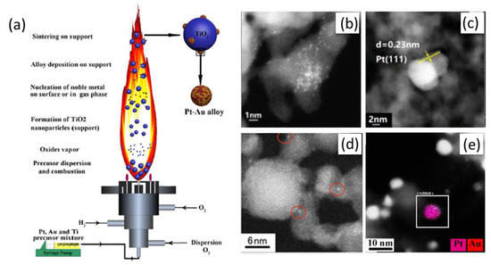 In addition to single loading, the co-loading of Au with other metals was also made possible using FS. Pongthawornsakun et al. studied various feeding methods to prepare Pd-Au-loaded TiO2 nanoparticles by mix feeding and separate feeding with different compositions, such as PdAu/TiO2, Pd/TiO2 + Au, Au/TiO2 + Pd, TiO2 + AuPd and Au/TiO2 + Pd/TiO2 [104]. It was found that there was no significant difference in the TiO2 structure of all samples in terms of the sizes and surface areas using cofeeding methods. In the prepared nanoparticles, the metallic nanoparticles were well distributed onto the TiO2 supports. Among the feeding methods, the TiO2 + AuPd composite catalyst produced by the two-nozzle FSP showed the highest photocatalytic activities of acetylene conversion with 50% efficiency and an ethylene selectivity greater than 95%. The possibility of bimetallic particles can be reduced by separate feeding. It is important that the cofeeding of metal precursor and Ti precursor produced a catalyst with a lower activity due to the coverage of the active metals by the Ti-O species [104]. Recently, Jiang et al. successfully prepared AuPt alloy cocatalyst-loaded TiO2 by mixing chloroplatinic acid hexahydrate and chloroauric acid as the Pt and Au precursors, respectively [105]. The formation mechanism of AuPd-loaded TiO2 particles and its nanostructures are presented in Figure 7a,e. The synergetic effects between Au and Pt reduced the agglomeration of metal particles, and CO poisoning was reduced. As a result, AuPt/TiO2 could enhance catalytic CO oxidation by 20% at a low-temperature reaction of 100 °C in comparison to single-metal loading.