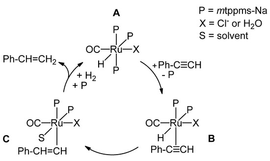 2.1.3. Mechanism of Phenylacetylene Hydrogenation in Aqueous–Organic Biphasic Solvent Mixtures Catalyzed by [RuHCl(CO)(mtppms-Na)3], 1, or [RuH(H2O)(CO)(mtppms-Na)3]+, 2